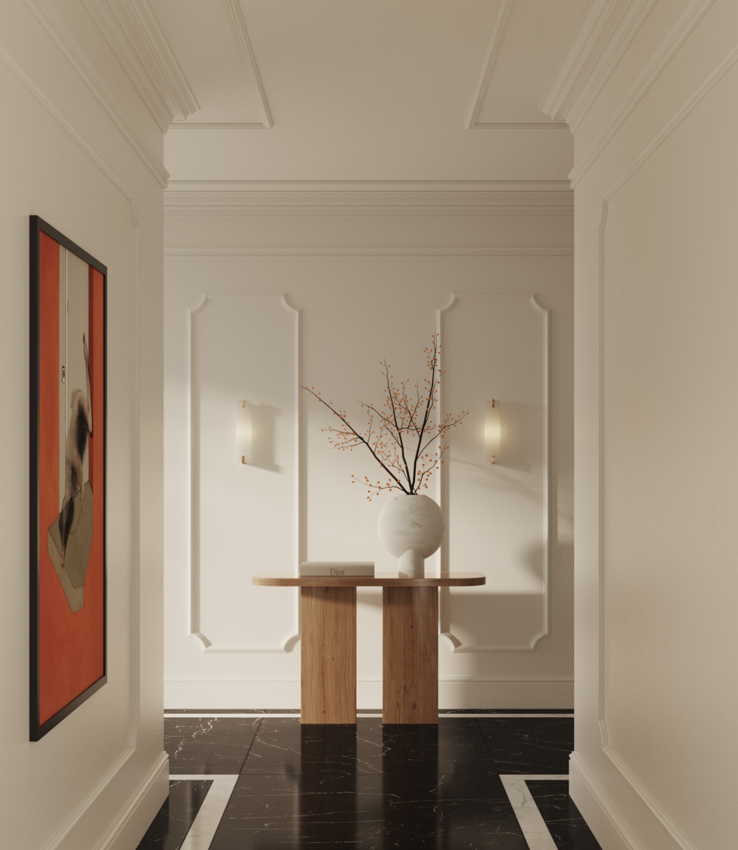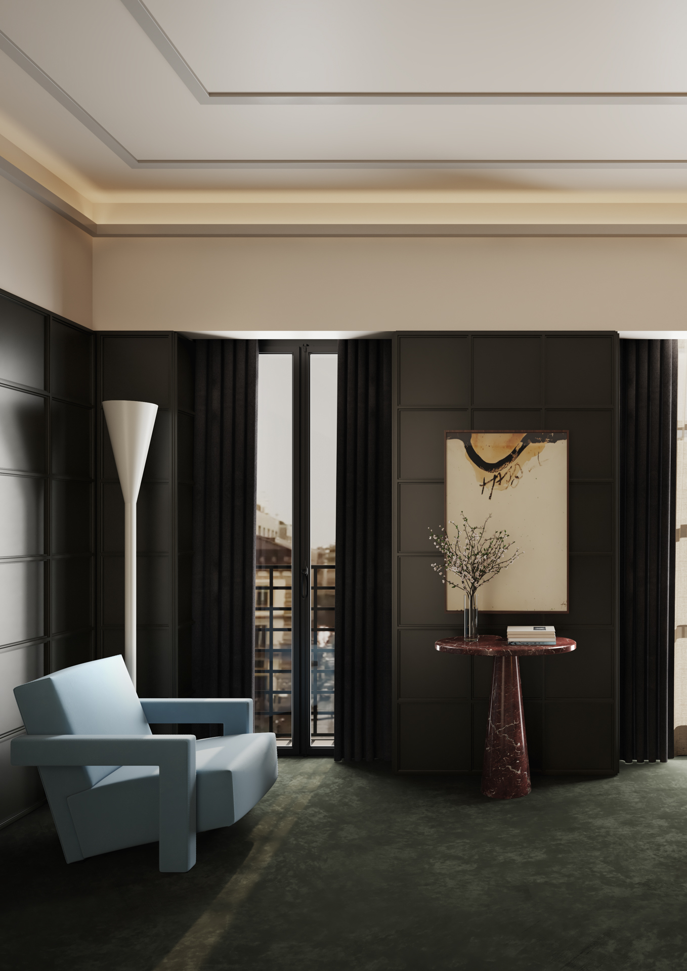 Podobnie jak w przypadku listew przypodłogowych, również listy przysufitowe możesz łączyć w celu uzyskania efektu optycznego, który sprawi, że pomieszczenie wyda się nie tylko eleganckie, ale również znacznie wyższe niż w rzeczywistości. Kreatywne połączenie listew sztukateryjnych to nie tylko sztuka dekoracyjna, ale także praktyczne narzędzie do manipulowania percepcją przestrzeni, podkreślając jednocześnie unikalny charakter wnętrza. Dla uzsykania efektu wow, połącz listwy o różnych grubościach, na przykład grubszą zamontuj tuż przy suficie a cieńszą pod nią na ścianie. Możesz także dodać listę na samym suficie - jak w aranżacji poniżej. To nada pomieszczeniu dynamicznego wyglądu i będzie kierować uwagę w górę.