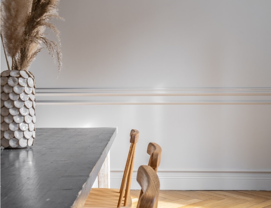 Połączenie wielu listew może być alternatywą do zastosowania paneli ściennych. Możesz w ten sposób wykończyć na przykład wyspę kuchenną lub dolną część ściany, tworząc efekt lamperii. Jak to zrobić? To proste: wykorzystaj listwę przypodłogową jako bazę, a następnie dodawaj listwy ścienne nad nią, montując je tuż obok siebie. Dodaj do tego zestawu listwę ze zdobieniami, dzięki czemu stworzysz piękny trójwymiarowy efekt, który z pewnością przyciągnie uwagę. Jak na aranżacji poniżej.