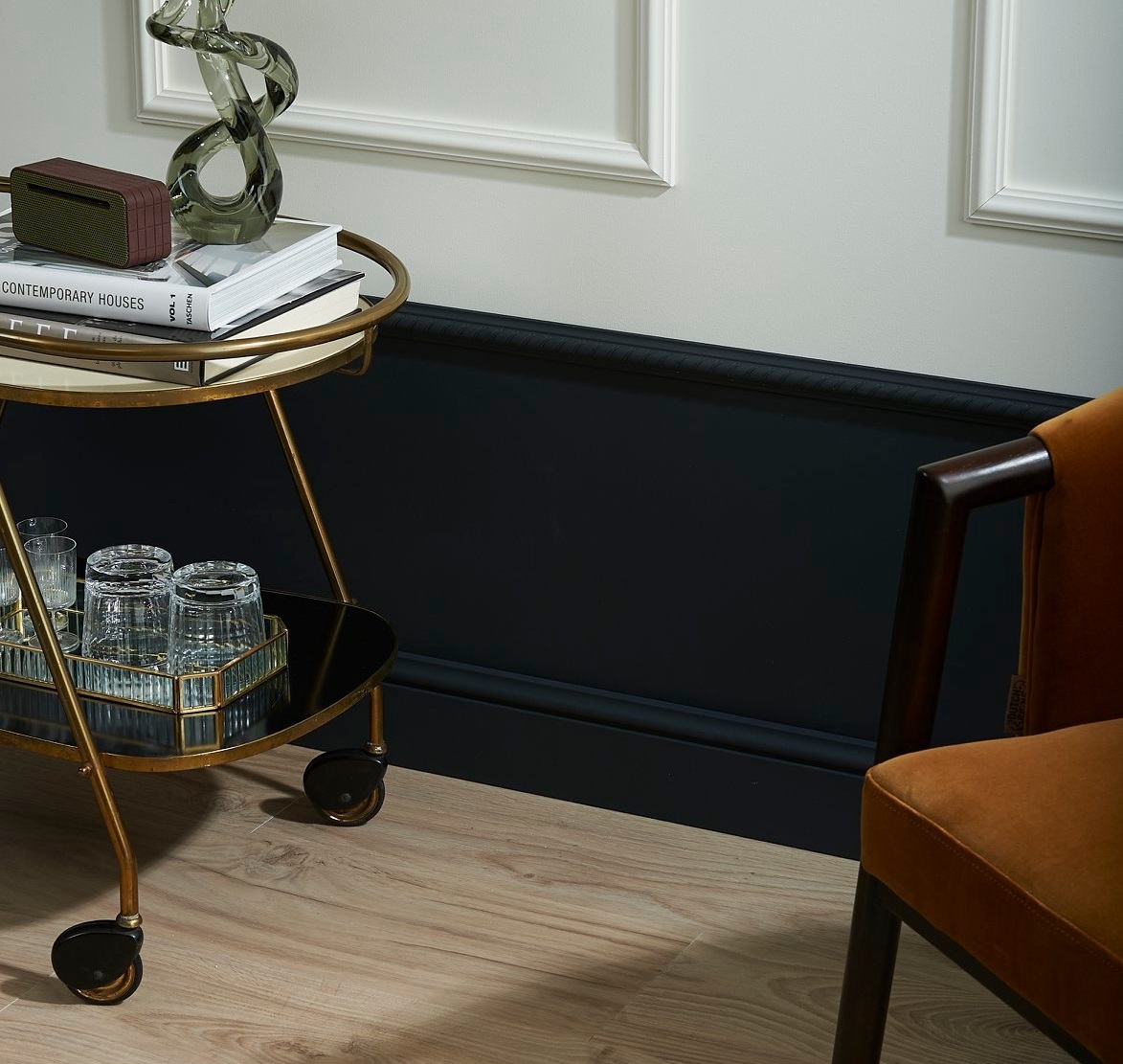 Stworzenie efektu lamperii za pomocą listwy przypodłogowej i ściennej to doskonały sposób na dodanie uroku i elegancji do wnętrza. Takie proste połączenie dwóch rodzajów listew może całkowicie odmienić charakter wnętrza. Poniżej zastosowana została listwa przypodłogowa FL4 oraz listwa ścienna WL1.