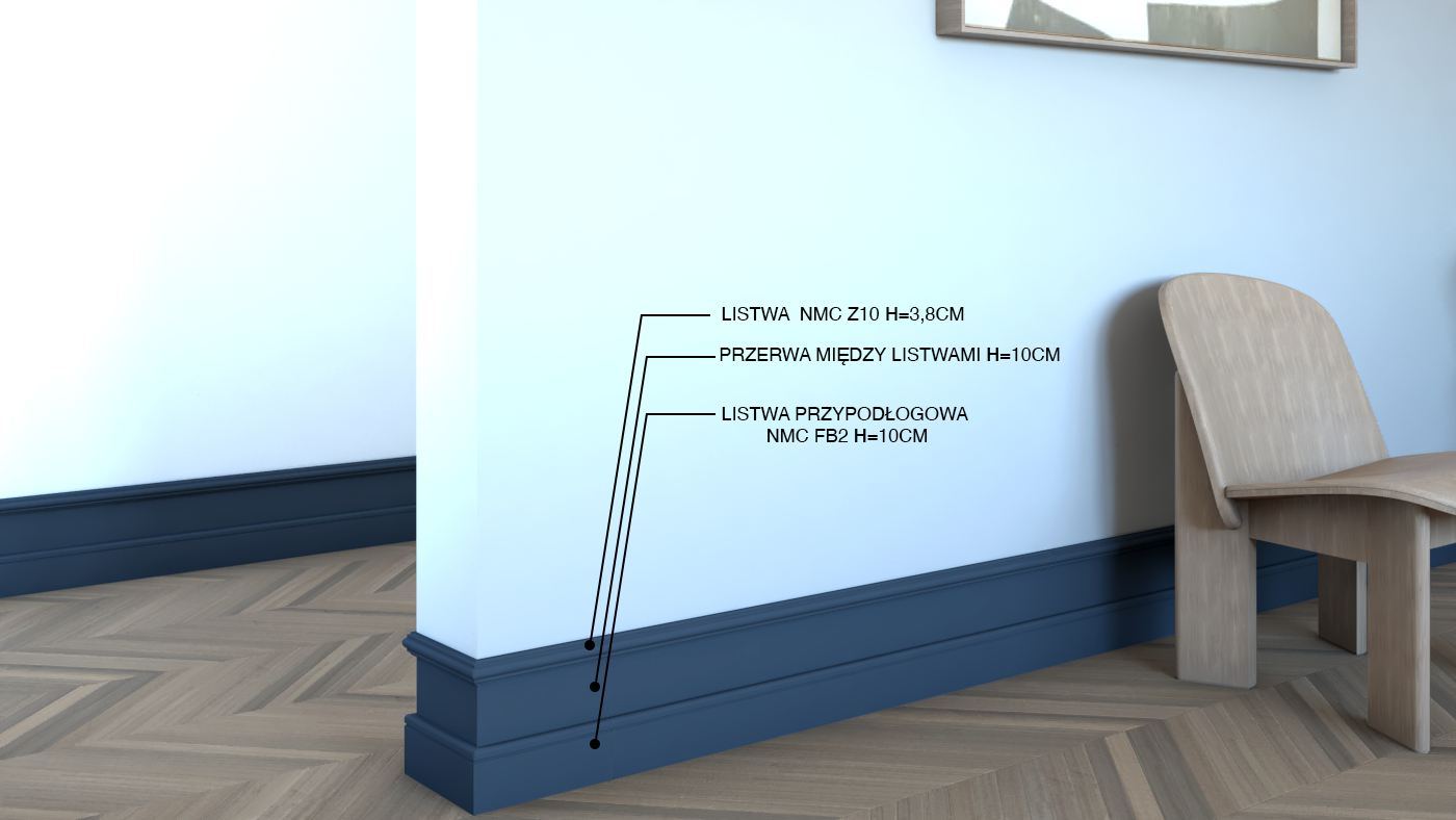 Aby uzyskać optycznie większą wysokość listwy, można użyć różnych listew, łącząc je ze sobą w taki sposób, aby uzyskać efekt warstwowy. To połączenie doda głębi i interesującego detalu. Poniżej propozycja połączenia listwy przypodłogowej FB2 o wysokości 10 cm oraz listwy ściennej Z10 o wysokości 3,8 cm. Dzięki zamontowaniu listew w odległości 10 cm od siebie oraz pomalowania całości na jeden, wyróżniający się na tle ściany kolor, uzyskany został efekt wysokiej prawie 24 cm listwy.