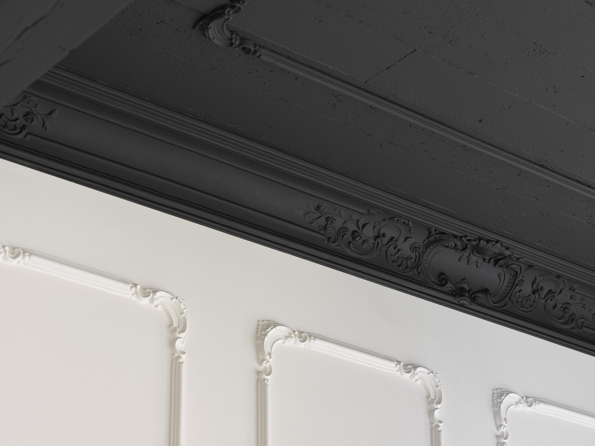 Poniżej kombinacja szerokiej ozdobnej listwy przysufitowej Z41 oraz listwy ściennej Z10 zamontowanej na suficie wraz z ozdobnym narożnikiem Z101. Całość sufitu pokryta farbą w ciemnym kolorze nadaje wnętrzu unikatowy charakter.