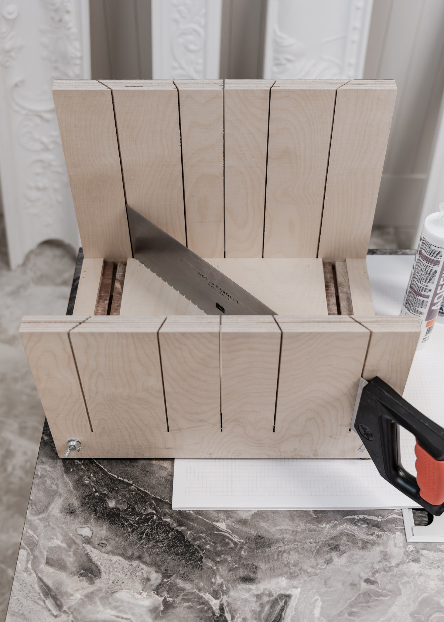 Skrzynka uciosowa o wymiarach wewnętrznych: dł.40cm, szer.25,5cm, wys.28(18)cm przeznaczona do grubych profili z poliuretanu (PU) i duropolimeru (HDPS). Posiada dwa regulowane ograniczniki, tnie pod kątem 45º, 22,5º oraz na prosto. Do skrzynki zalecamy piłę do profili twardych PU/HDPS (nie jest częścią zestawu).